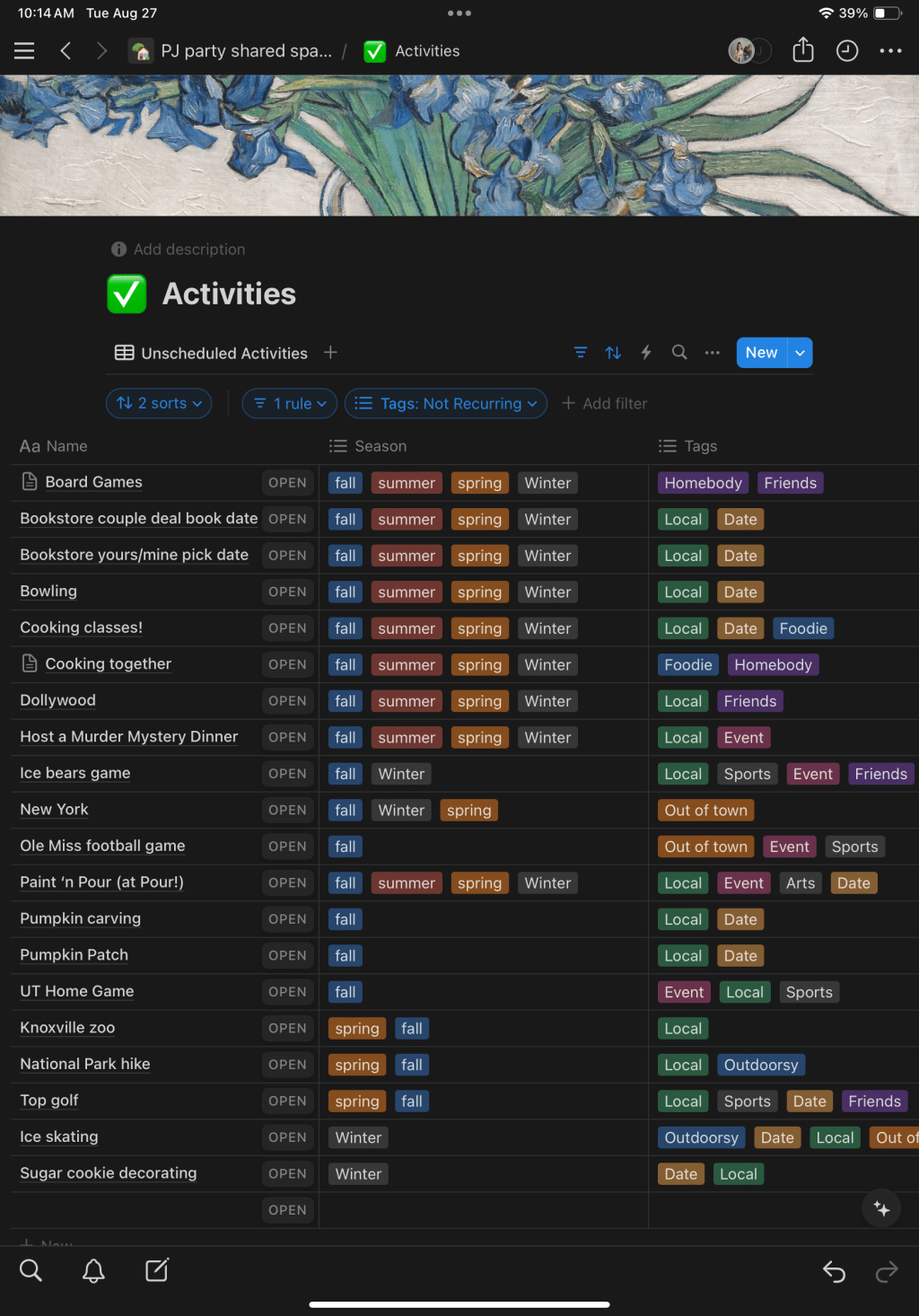 My boyfriend and I both work in the data realm, though in very different capacities. Our vacation planning spreadsheets are absolutely legendary thanks to our combined talents. So, when I looked at him a few weeks ago and asked if we could make a proper spreadsheet of activities we want to do this fall, things